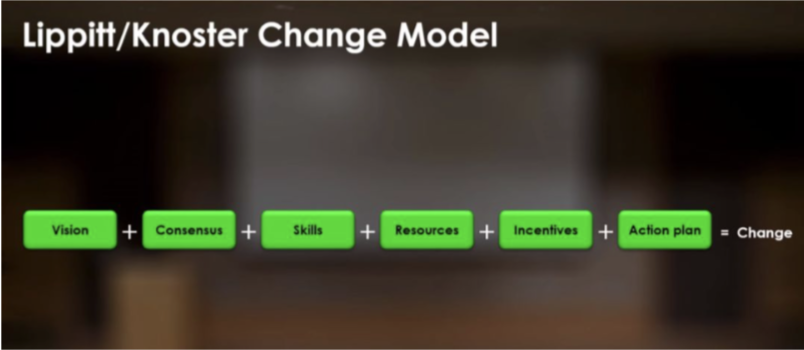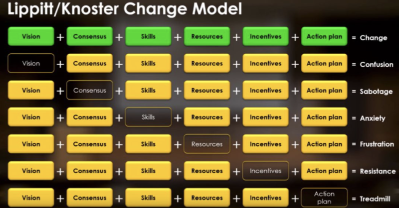 The Knoster model认为变革想要取得成功,必须要具备这些要素:愿景,共识,技能,资源,激励和行动计划。